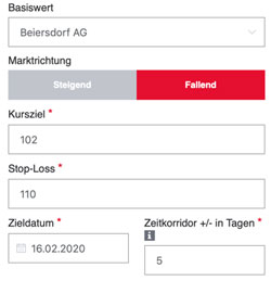 Aufgrund des eingegebenen Ziels Mitte Februar 2020 und einem Zeitkorridor von +/- 5 Tagen, bringt ein Endlos-Turbo Short (WKN: SR4FZP) Stand heute den maximalen Gewinn. Aktuell notiert der Turbo-Long, der einen Basispreis von 110,79 Euro hat, bei 0,59 Euro (Brief) // 0,47 Euro (Geld). Wenn Beiersdorf im erwarteten Zeitraum bei 102 Euro notiert, sollte der Endlos-Turbo Short auf 0,88 Euro (Brief) // 0,87 Euro (Geld) steigen.