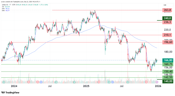 Mit einem Inline-Optionsschein, bezogen auf die Aktie der Adidas AG (FD3LR3), können risikofreudige Anleger einen maximalen Auszahlungsbetrag von 10,00 Euro erzielen. Dafür muss sich der Kurs bis einschließlich 20.03.26 durchgehend innerhalb der für den Inline-Optionsschein maßgeblichen Spanne zwischen 140,00 Euro auf der Unterseite und 240,00 Euro auf der Oberseite bewegen. Gerechnet vom Stand des Scheins am 22. Dezember 2025 um 20:00 Uhr (Briefkurs 7,78 Euro) würde dies einem annualisierten Kursgewinn von 118,35 Prozent entsprechen. Wird eine der beiden Knockout-Schwellen erreicht, tritt ein Totalverlust des eingesetzten Kapitals ein. Falls der Kurs unter den Supportbereich bei 142,55 Euro fällt oder über den Widerstand bei 236,30 Euro klettert, sollte zur Vermeidung eines Knockouts der vorzeitige Ausstieg aus der spekulativen Position erwogen werden. Der Preis des Inline-Optionsscheins reagiert während der Laufzeit darauf, ob die Wahrscheinlichkeit des Erreichens einer der beiden Schwellen zu- oder abnimmt.
