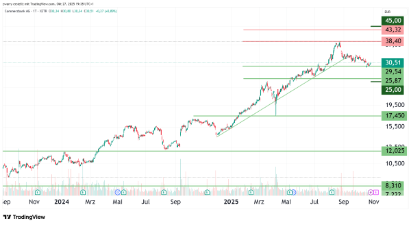 Der Aktienkurs der Commerzbank befand sich bis zum 19. März 2025 in einem deutlichen Aufwärtstrend. Anfang April führte der sogenannte Liberation-Day zu einem kurzfristigen Kurseinbruch von rund 30 Prozent auf 17,45 Euro. Dieser Kurseinbruch erfolgte „V“-förmig, wodurch das Papier wieder zulegte und am 22. August 2025 ein 14-Jahreshoch bei 38,40 Euro markierte. Aktuell notiert die Commerzbank-Aktie mit 30,51 Euro gut 20 Prozent unter dem Hoch. Im großen Bild betrachtet befindet sich der Aktienkurs seit dem Allzeittief am 16. März 2020 bei 2,80 Euro in einer übergeordneten Aufwärtssequenz. Die folgende Erholung erfuhr ab dem Bekanntwerden des Übernahmeversuchs der Unicredit im September 2024 ein Kursplus von rund 115 Prozent. Seit dem 14-Jahreshoch bei 38,40 Euro litt das Papier jedoch unter Abgabedruck. So war der Aktienkurs im Vergleich mit europäischen Banken überbewertet, was möglicherweise die Korrektur begünstigt hat. Läuft die Konsolidierung in diesem Tempo bis zum 19.12.2025 weiter (Zeitspanne von 7,5 Wochen), könnte sich der Kurs oberhalb der Unterstützung bei 25,87 Euro halten. Einen beträchtlichen Einfluss auf die Banktitel übt der Leitzins aus. Dieser wird Ende der Woche von der EZB veröffentlicht. Die Marktteilnehmer gehen davon aus, dass die EZB den Leitzins konstant hält. Eine überraschende Leitzinssenkung könnte aber zu einem Abverkauf der europäischen Banktitel führen.