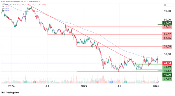 Mit einem Inline-Optionsschein, bezogen auf die Aktie der Porsche AG (FD6DFU), können risikofreudige Anleger einen maximalen Auszahlungsbetrag von 10,00 Euro erzielen. Dafür muss sich der Kurs bis einschließlich 17.04.26 durchgehend innerhalb der für den Inline-Optionsschein maßgeblichen Spanne zwischen 40,00 Euro auf der Unterseite und 75,00 Euro auf der Oberseite bewegen. Gerechnet vom Stand des Scheins am 12. Januar 2026 um 20:00 Uhr (Briefkurs 6,02 Euro) würde dies einem annualisierten Kursgewinn von 254,01 Prozent entsprechen. Wird eine der beiden Knockout-Schwellen erreicht, tritt ein Totalverlust des eingesetzten Kapitals ein. Falls der Kurs unter den Supportbereich bei 40,82 Euro fällt oder über den Widerstand bei 73,02 Euro klettert, sollte zur Vermeidung eines Knockouts der vorzeitige Ausstieg aus der spekulativen Position erwogen werden. Der Preis des Inline-Optionsscheins reagiert während der Laufzeit darauf, ob die Wahrscheinlichkeit des Erreichens einer der beiden Schwellen zu- oder abnimmt.