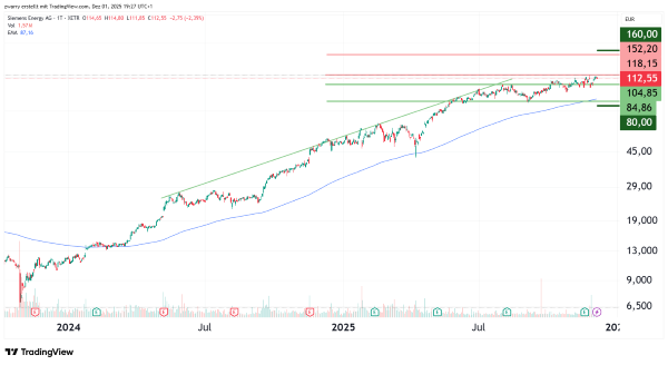 Seit Jahresbeginn verzeichnet der Energietechnikkonzern Siemens Energy (ENR) ein Kursplus von rund 129 Prozent. Im deutschen Leitindex DAX weist nur der Rüstungskonzern Rheinmetall mit einer mehr als dreifachen Wertsteigerung eine bessere Performance auf. Schwierigkeiten bei der Tochtergesellschaft Gamesa führten am 26. Oktober 2023 zum Allzeittief der ENR-Aktie bei 6,40 Euro. Seitdem hat der Kurs um etwa 1.663 Prozent zugelegt und schloss gestern bei rund 112,55 Euro. Die derzeitige Seitwärtsbewegung ist im historischen Verlauf der Aufwärtsphase die vierte ihrer Art seit dem Allzeittief. Kurzfristig betrachtet war der jüngste Ausbruch über das bisherige Allzeithoch bei 104,85 Euro nicht nachhaltig. Dennoch könnte sich der Kurs in naher Zukunft am von der Royal Bank of Canada prognostizierten fairen Wert von 136 Euro je Aktie orientieren. Als Unterstützung könnte sich das eng gefasste Level bei 104,85 Euro anbieten. Sollte dieser Bereich unterschritten werden, hat sich bei Kursrückgängen der Bereich um 84,86 Euro etabliert. Fundamental betrachtet liegt die Konsensschätzung für den Bilanzgewinn je Aktie im Geschäftsjahr 2026/27 derzeit bei 4,03 Euro. Dies entspricht einem Anstieg von 147 Prozent im Vergleich zum Geschäftsjahr 2024/25 und führt zu einem erwarteten Kurs-Gewinn-Verhältnis (KGV) von 26,64 für 2026/27.