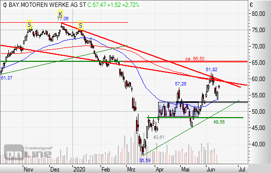 Als das Wertpapier des bayerischen Automobilherstellers BMW im Bereich einer multiplen Widerstandszone bestehend aus zwei Abwärtstrendlinien und dem 200-Tage-Durchschnitt angelangt war, drehte die Aktie wie erwartet zur Unterseite ab. Nun könnte bereits ein spekulativer Long-Einstieg über das vorgestellte Faktor Zertifikat Long auf BMW WKN VE728J eingegangen werden oder aber erst noch ein nachhaltiger Ausbruch mindestens über das Niveau von 61,50 Euro abgewartet werden. In beiden Fällen ist die Trendrichtung nach heutigem Stand eindeutig zur Oberseite gerichtet.