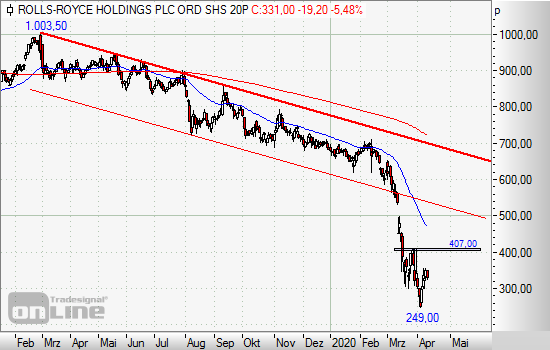 Die Osterfeiertage sind rum und nun steht wieder die Corona-Pandemie und dessen Folgen im unmittelbaren Fokus der Anleger. Dabei führt China die Liste mit den Aufhebungen der Beschränkungen klar an, nach und nach dürften sich mehr Länder diesem Schritt anschließen und für eine potenzielle Erholung an den Märkten sorgen. Neuesten Daten zufolge bremste sich der Fall der chinesischen Wirtschaft unerwartet ab, dass wiederum Schnäppchenjäger auf den Plan gerufen und für eine merkliche Erholung gesorgt hatte. Ähnlich sieht es beim Wertpapier des Maschinenbauers Rolls Royce aus, die nach einem Tief bei 250,00 Pencewieder sichtlich zulegen konnte und aus der volatilen Phase der letzten Wochen sogar ein Boden hervorgehen könnte. Dabei können kurz- sowie mittelfristig orientierte Investoren profitieren, wenn sich die Lage an den Märkten weiter entspannt.