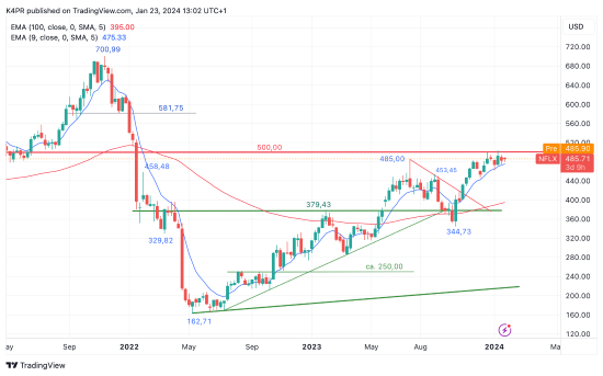 Heute wird der US-Streamingdienstleister frische Zahlen zum abgelaufenen Quartal vorstellen und die Akte sicherlich in die eine oder andere Richtung anschieben. Erwartet wird eine positive Reaktion mit einem einhergehenden Kurssprung mindestens über 500,00 US-Dollar. Dann könnte auch die in der letzten Woche vorgestellte Long-Idee über das Faktor Zertifikat Long auf Netflix WKN MD7W9N mit einem Ziel bei 581,75 US-Dollar zünden und eine beachtenswerte Renditechance ermöglichen. Eine Vorabpositionierung wäre anhand der zuletzt gemeldeten Daten zu den abgelaufenen Quartalen möglich.