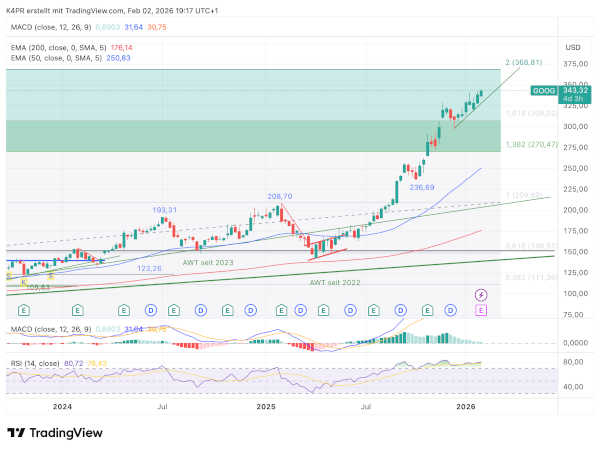 Auch aus Sicht der Kursentwicklung zeigt sich die Alphabet-Aktie trotz kleinerer Rücksetzer in den vergangenen Tagen weiterhin robust. Zu Beginn der Woche erreichte die Aktie ein neues Allzeithoch und versucht nun, sich dauerhaft über das vorherige Rekordniveau von 345,13 US-Dollar aus der vergangenen Woche zu etablieren.