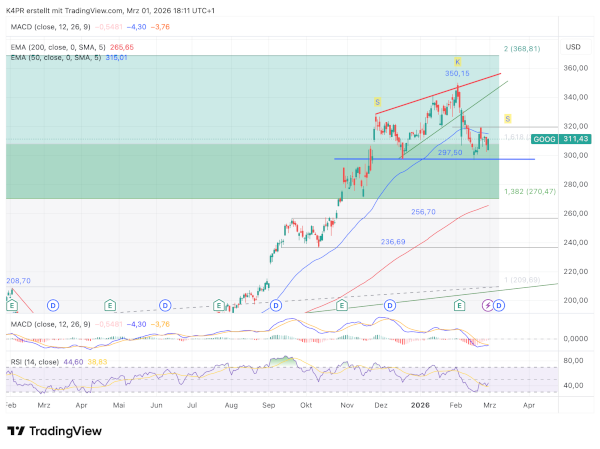 Um das negative Szenario abzuwenden, müsste die Alphabet-Aktie auf Tagesbasis mindestens über 329,00 US-Dollar steigen. Dann bestünde die Chance auf eine erneute Aufwärtsbewegung mit möglichen Kurszielen bei 350,15 US-Dollar. Allerdings könnte selbst ein solcher Anstieg später noch in ein sogenanntes Doppelhoch münden – ein weiteres Warnsignal aus charttechnischer Sicht, wenn auch in anderer Form.