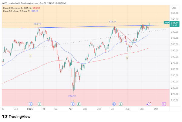 Lange Zeit mussten Investoren auf diese Signallage bei der American-Express-Aktie warten, nun verdichten sich die Hinweise auf einen erfolgreichen Ausbruch über die Nackenlinie einer großen inversen SKS-Formation zwischen 220,43 und grob 329,14 US-Dollar. Ein erfolgreicher Wochenschlusskurs über diesem Niveau könnte in der Folge kurzfristiges Aufwärtspotenzial an 366,60 und mittelfristig sogar auf 425,22 US-Dollar freisetzen. Ein sehr spannender Wert, wenn es um kurz- bis mittelfristige Anlagehorizonte geht. Einen Strich durch die Rechnung der Bullen könnte dagegen nur ein nachhaltiger Rückfall unter den 50-Tage-Durchschnitt bei 315,13 US-Dollar machen, eine derartige Entwicklung würde Verlustrisiken zurück auf das Niveau der rechten Schulter und den dort befindlichen EMA 50 um 288,34 US-Dollar eröffnen. Angesichts des Vorstoßes vom Mittwoch wird ein solches Szenario nicht favorisiert.