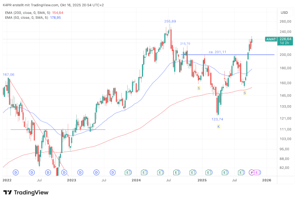 Setzt sich die Aufwärtsdynamik in der bisherigen Form weiter fort, dürfte es nur eine Frage der Zeit werden, bis Applied Materials seine Rekordstände aus dem Vorjahr bei 255,89 US-Dollar einem Test unterzieht. Eine vollständige Umsetzung der inversen SKS-Formation birgt hingegen Kurspotenzial bis auf 268,48 US-Dollar und damit ein weiteres wichtiges Mittelfristziel. Dennoch sollten sich Investoren auf potenzielle Rücksetzer zurück auf das Ausbruchsniveau bei 201,11 US-Dollar im Rahmen eines Pullbacks stets einstellen. Erst darunter würde sich eine längere Korrekturphase zunächst in den Bereich des 50-Wochen-Durchschnitts bei 178,91 und darunter auf 162,47 US-Dollar einstellen.