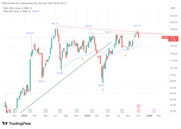 Technisch steht der Aktie immer noch der Weg auf der Oberseite offen, eine erfolgreiche Auflösung dürfte jedoch erst mit einem Kurssprung mindestens über 182,90 US-Dollar einhergehen und die im Vorfeld aufgebaute inverse SKS-Formation sukzessive umsetzen. Rein rechnerisch wären auf Sicht der nächsten Monate sogar Kursgewinne bis auf die 256,08 US-Dollar bei ARM vorstellbar, sofern das Kaufsignal durch einen späteren Wochenschlusskurs bestätigt wird. Bleibt es bei dem zurückliegenden Fehlausbruch, müsste unterhalb eines Preises von 153,85 US-Dollar ein erneuter Test des 200-Tage-Durchschnitts bei 143,61 US-Dollar und darunter sogar das Niveau der linken Schulter bei 127,03 US-Dollar zwingend eingeplant werden und sich für ein tendenzielles Short-Engagement im Rahmen einer gewöhnlichen Konsolidierung anbieten. Bis auf Weiteres wird vorläufig noch die bullische Variante mit einem späteren Ausbruch favorisiert.