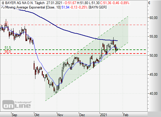 Von hier könnte den Papieren wieder ein Richtungswechsel nach oben gelingen. Solange der steigende Trendkanal weitgehend hält, wäre dann mit einem erneuten Angriff auf den wichtigen 200er-EMA im Bereich von 54,00 Euro zu rechnen. Hier sind die Aktien zuvor wieder nach unten abgeprallt.