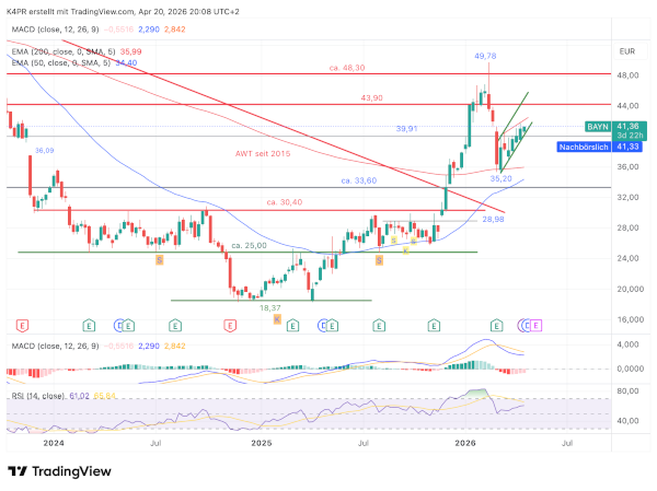 Das erwähnte Keilmuster könnte allerdings noch einmal für Druck sorgen und den Kurs zurück in Richtung der Märztiefs bei 35,20 Euro bewegen. Gleichzeitig haben die Käufer weiterhin die Chance, das Blatt zu wenden: Sollte die Aktie zeitnah über die Marke von 43,90 Euro steigen, wäre der Weg nach oben wieder frei. In diesem Fall könnten Kursziele bei 48,30 Euro und später sogar bei rund 53,32 Euro in den Fokus rücken.