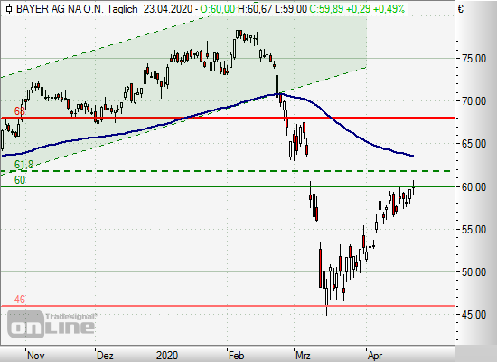 1. Short-Position um 60,00 bis 61,80 Euro möglich. Stopp bei 68,00 Euro. Kursziel 46,00 Euro.