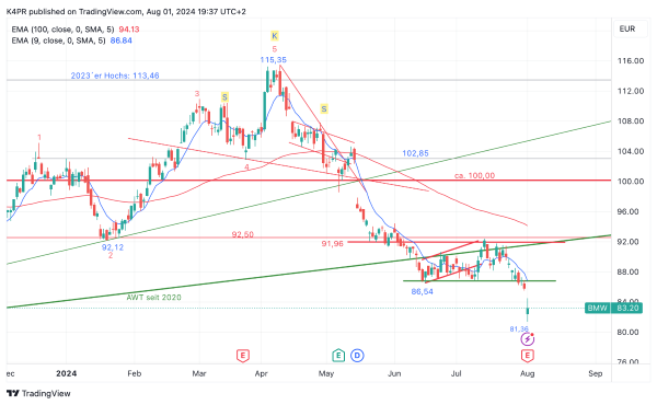 Investierte Anleger können durch den Kursrutsch vom Donnerstag auf 81,36 Euro einen Teil ihrer Gewinne realisieren, schließlich wurde das Ziel bei einem Bruch von 86,54 Euro auf 83,04 Euro beziffert. Durch die Auflösung der Handelsspanne liegen aber weitere Rückfallrisiken im Markt, unterhalb von 81,36 Euro auf insgesamt 79,90 Euro und würden die Renditechance noch einmal sichtlich steigern. Wer den Einstieg verpasst hat, dem bietet sich um 86,54 Euro ein potenzielles Einstiegsniveau nach erfolgreicher Beendigung eines Pullbacks auf der Oberseite. Vorläufig bleibt die BMW-Aktie auf der Short-Seite zu sehen, Long-Signale gehen aus den schwachen Daten des Unternehmens nicht hervor.