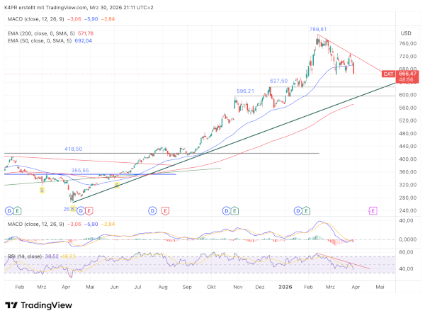Gleichzeitig eröffnet genau dieser Bereich auch Chancen für langfristig orientierte Investoren. In der Nähe von 606,65 US-Dollar könnte sich eine Stabilisierung ergeben, die als Ausgangspunkt für einen neuen Anstieg dient. In einem solchen Fall wären erste Kursziele im Bereich von 692,19 US-Dollar, wo der 50-Tage-Durchschnitt verläuft, sowie darüber bei 730,48 US-Dollar denkbar.