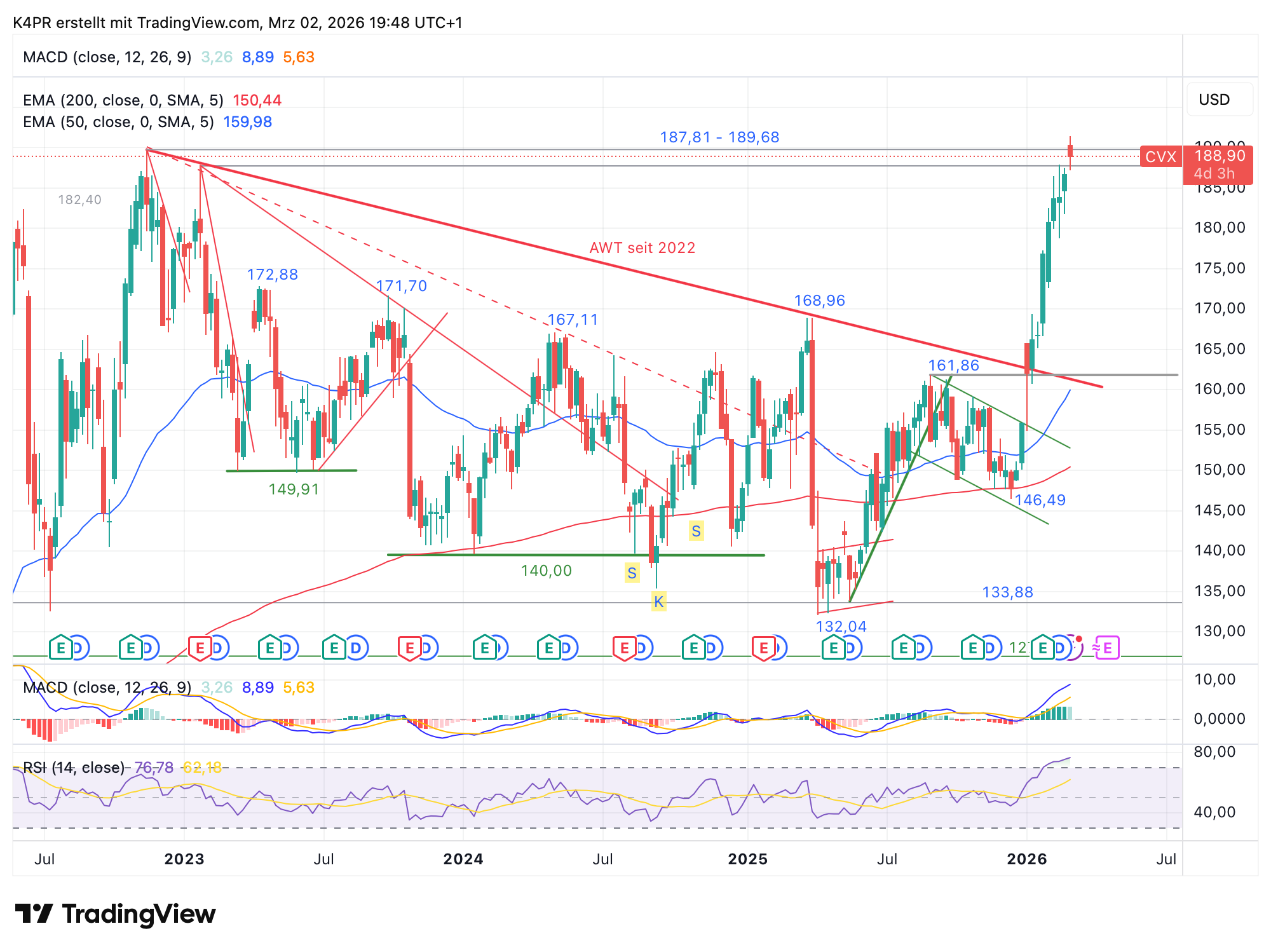 Die Chevron-Aktie hatte bereits Mitte Januar ein wichtiges charttechnisches Signal geliefert: Mit dem Sprung über 162,00 US-Dollar wurde ein seit 2022 bestehender Abwärtstrend überwunden. Damit entstand ein größeres Kaufsignal. Als mittelfristiges Ziel galten die früheren Hochs aus dem Jahr 2022 im Bereich zwischen 187,81 und 189,68 US-Dollar. Genau diese Zone hat die Aktie inzwischen erreicht.