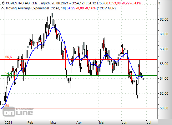 Solange die Aktien unter dem 10er-EMA bei 54,28 Euro notieren, ist mit weiter fallenden Kursen zu rechnen. Die erste Anlaufmarke wäre dann die Unterstützung um 53,00 Euro, gefolgt von der Unterstützung bei 50,00 Euro. Der Abwärtstrend ist mit einer Kette von tieferen Verlaufshochs und tieferen Verlaufstiefs intakt.