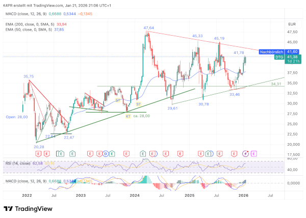 Die Rede ist von einem großen, seitwärts gerichteten Keil, der den seit März 2022 bestehenden Aufwärtstrend bei erfolgreicher Auflösung auf der Oberseite fortsetzen sollte und dadurch mittel- bis langfristig neue Rekordstände bereithält. Hierzu müsste Daimler Truck jedoch mindestens auf Wochenbasis über 44,00 Euro ausbrechen, damit zunächst das Rekordniveau aus 2024 bei 47,64 Euro angepeilt werden kann. Später könnte Daimler Truck Kurs auf 55,06 Euro nehmen und das symmetrische Dreieck weit hinter sich lassen. Auf der Unterseite findet das Wertpapier derzeit am EMA 50 (blaue Linie) bei 37,85 Euro eine vergleichsweise starke Unterstützung vor, darunter auf der unteren Keilbegrenzung um 35,40 Euro. Nur eine Auflösung zur Unterseite würde ein bärisches Szenario für die Aktie einläuten.