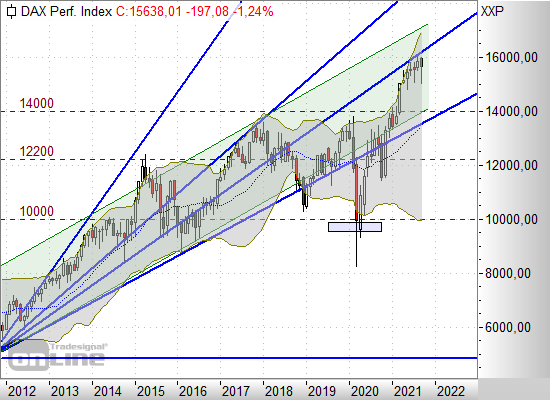 DAX unterm Fibonacci-Fächer im Monatschart bei 15.950/16.000 Punkten langfristig mit fallenden Kursen erwartet.