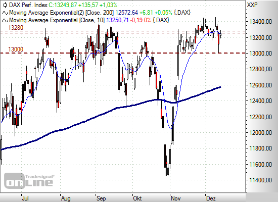 Anlaufmarken nach unten bei 13.200, 13.100, 13.000 und 12.600 Punkten. Nach oben bei 13.300, 13.350 und 13.500 Punkten.