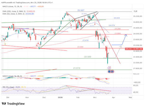 Nach unten hin gelten kleinere Rücksetzer bis 22.320 Punkte noch als unproblematisch. Sollte der DAX jedoch darunter fallen, könnte die Marke von 21.513 Punkten wieder stärker in den Fokus der Anleger rücken.