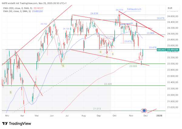 VDAX-New der Deutschen Börse (24. November 2025): Bei 21,22% (ansteigend) (Vortag: 23,42%). Über 17% kaum stärkere Abwärtsbewegung.