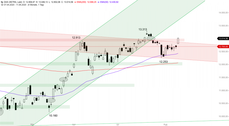 Anlaufmarken nach unten bei 13.000, 12.800, 12.700 und 12.600 Punkten. Nach oben bei 13.072, 13.100 und 13.310 Punkten.