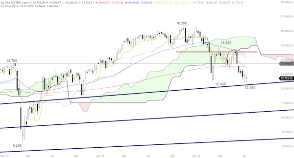 Anlaufmarken nach oben bei 12.750, 12.850, 12.880, 12.950, 13.000 und 13.200 Punkten. Nach unten bei 12.700, 12.600, 12.500, 12.480 und 12.400 Punkten.