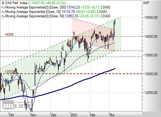 Anlaufmarken nach oben bei 14.450 und 14.500 Punkten. Nach unten bei 14.400, 14.300, 14.200, 14.100 und 14.000 Punkten.