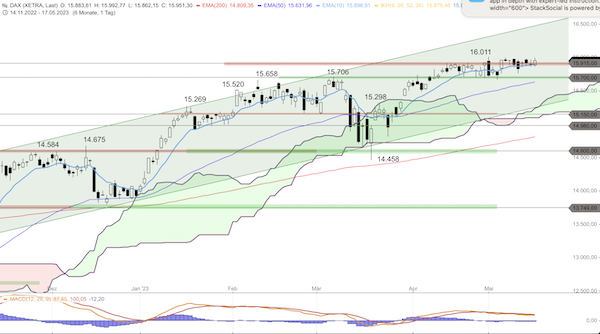 Am Vortag hieß es: "Solange der 10er-EMA verteidigt werden kann, ist mit eher weiter steigenden Kursen im DAX zu rechnen. Bei einem Kursrutsch unter den 10er-EMA wäre ein Rücklauf bis zur Unterstützung bei 15.700 Punkten zu erwarten. Die Seitwärtsphase sollte zunächst weitergehen." Das hat weitgehend gepasst. Der DAX konnte etwas ansteigen und den 10er-EMA verteidigen, ein Durchbruch über 16.000 Punkte gelang aber noch nicht.