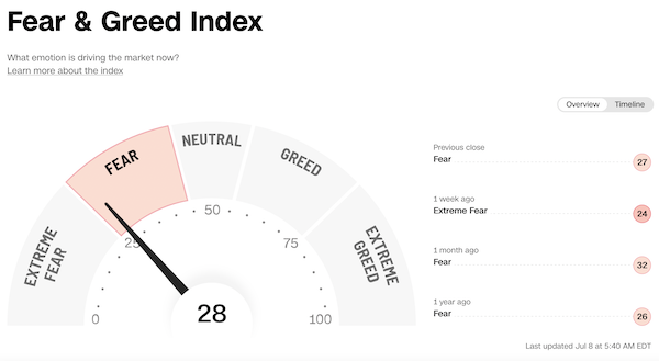 1. CNN Money's Fear & Greed Index (07. Juli 2022): Bei 28 (Vortag: 24) Punkten, Modus "Extreme Fear".