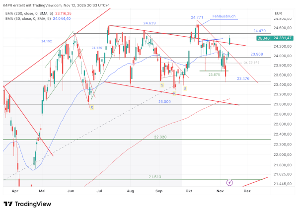 Anlaufmarken nach oben bei 24.350 / 24.479 / 24.639 und 24.771 Punkten, nach unten bei 23.845 / 23.476 / 23.383 und 23.359 Punkte Punkten.