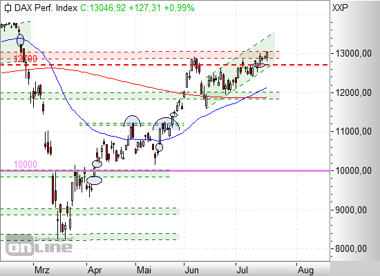 Anlaufmarken nach unten bei 13.000, 12.900, 12.850, 12.800, 12.740 und 12.700 Punkten. Nach oben bei 13.100, 13.140 und 13.200 Punkten.