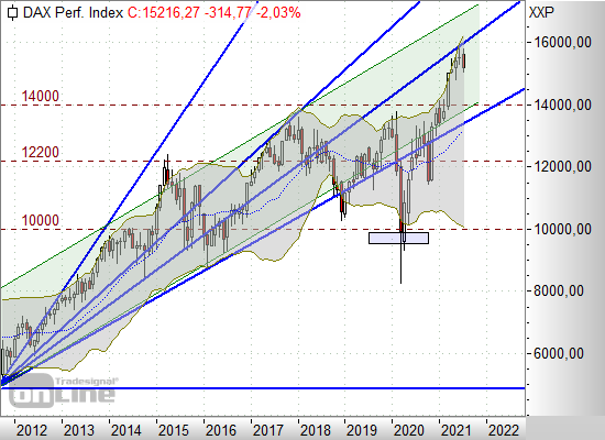 Gaps nach oben bei 13.500 Punkten und nach unten bei 13.697, 11.391, 10.547, 10.097, 9.626 und 8.830 Punkten offen.