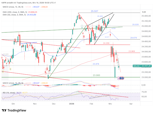 Jeder weitere Tag der Blockade der Straße von Hormus erhöht weltweit zum einen die Inflationsrisiken und zum anderen die Gefahr eines Abschwungs der Weltwirtschaft - auch als Stagflation bekannt. Die Börsen reagierten in der letzten Woche entsprechend nervös auf diese Hiobsbotschaften und gaben sichtlich nach. Dennoch riss der deutsche Aktienindex DAX nicht sein aktuelles Monatstief bei 23.000 Punkten, sondern beendete seinen Handel rund 450 Punkte darüber. Doch der auf die US-Indizes ausgeübte Verkaufsdruck zum Ende der letzten Woche könnte für den DAX einen erneut schwächeren Start begründen und unmittelbare Abschlagsrisiken zurück auf 22.320 und darunter 21.513 Punkte eröffnen. Bis zum jetzigen Zeitpunkt sind nämlich keinerlei Anzeichen einer Entspannung im Nahen Osten zu verzeichnen, ganz im Gegenteil! Um ein bullisches Setup für den DAX skizzieren zu können, müsste das Barometer überzeugend mindestens über 25.285 Punkte ansteigen, was unter den aktuellen Umständen kaum vorstellbar erscheint. Daher bleibt vorläufig die Short-Variante die erste Wahl für kurzfristig agierende Anleger.