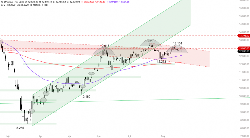 1. Short-Position um 13.000 Punkte möglich. Stopp bei 13.150 Punkten. Kursziel 12.500 Punkte.