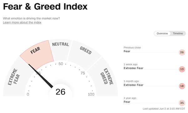 1. CNN Money's Fear & Greed Index (01. Juni 2022): Bei 26 (Vortag: 21) Punkten, Modus "Fear".
