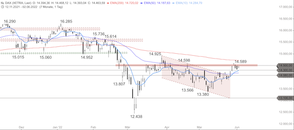 Anlaufmarken nach oben bei 14.450, 14.500, 14.550, 14.580, 14.600, 14.730 und 14.800 Punkten. Nach unten bei 14.400, 14.300, 14.200, 14.100 und 14.000 Punkten.