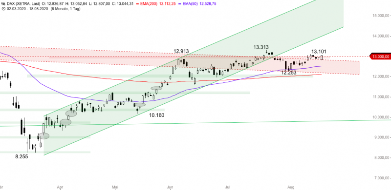 Anlaufmarken nach unten bei 13.000, 12.900, 12.800, 12.700, 12.600 und 12.500 Punkten. Nach oben bei 13.100, 13.300 und 13.500 Punkten.