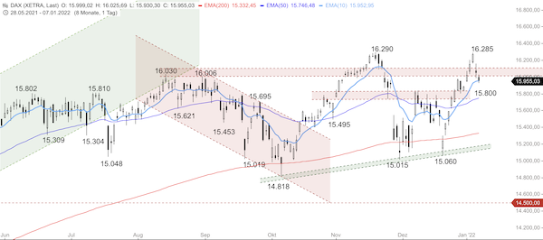 Anlaufmarken nach oben bei 16.000, 16.100 und 16.290 Punkten. Nach unten bei 15.900, 15.800, 15.700, 15.650, 15.600, 15.550, 15.260 und 15.000 Punkten.
