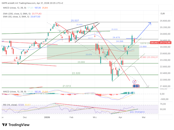 Ob diese Stabilisierung gelingt, hängt stark davon ab, ob sich die geopolitische Lage entspannt. Bleibt eine solche Entspannung aus, droht ein weiterer Rückgang bis auf 23.476 Punkte. In diesem Fall wäre auch das zuletzt entstandene positive Signal für steigende Kurse hinfällig.