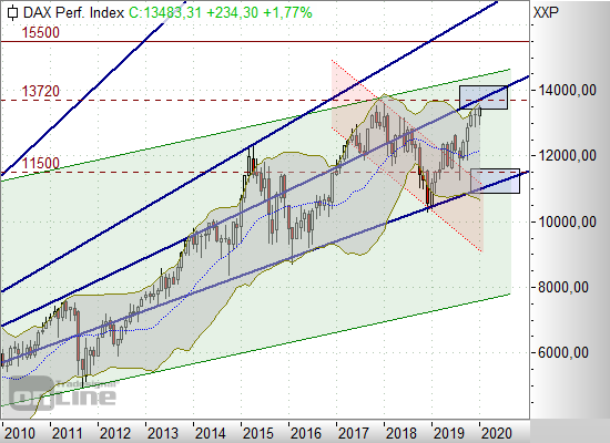 Sollte eine große Korrektur ins Rollen kommen, dienen diese tiefen Gaps als Anlaufmarken. Ein erstes Signal für eine langfristige Korrektur wären allerdings erst Kurse im DAX unter 13.300 Punkten. Über 13.300 Punkten ist trotz kurzfristiger Abgaben mit einem weiteren Hochlauf bis 13.700 Punkte zu rechnen.