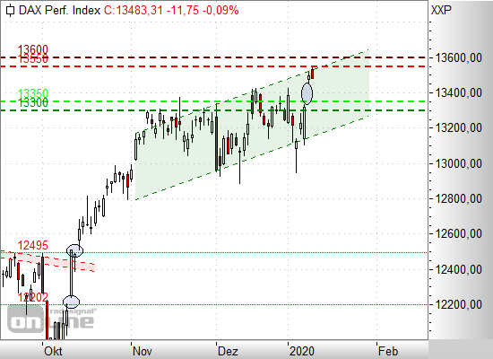 1. Short-Position zwischen 13.500/13.550 Punkten möglich. Stopp bei 13.620 Punkten. Kursziel zunächst 13.334 Punkte (offenes Gap).