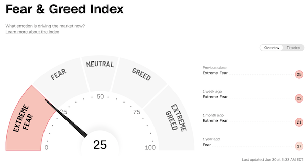 1. CNN Money's Fear & Greed Index (29. Juni 2022): Bei 25 (Vortag: 26) Punkten, Modus "Extreme Fear".