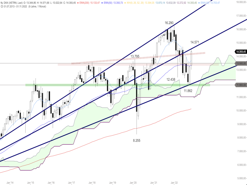 Solange der DAX über dem 10er-EMA notiert, ist kurzfristig mit eher weiter steigenden Kursen bis zum Fibonacci-Fächer bei 14.600 Punkten zu rechnen. Ein nachhaltiger Durchbruch nach oben ist aber weiterhin unwahrscheinlich, da die Steigung zu schnell für den aktuellen DAX-Anstieg ist. Ab Dezember notiert der Fibonacci-Fächer bereits im Bereich von 14.650 Punkten. Zudem befindet sich im Bereich von 14.700 Punkten ein weiterer Widerstand. Rutscht der DAX hingegen unter den 10er-EMA wäre mit einem weiteren Kursrückgang bis zur Unterstützung im Tageschart bei 13.750 Punkten sowie zum 10er-EMA im Monatschart bei 13.700 Punkten zu rechnen.