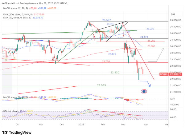 Eine kurzfristige Erholung am deutschen Aktienmarkt ist zwar nicht ausgeschlossen, aber derzeit wenig wahrscheinlich. Aus technischer Sicht müsste der DAX dafür auf Tagesbasis klar über 23.200 Punkte steigen, um eine Bewegung in Richtung 23.968 Punkte einzuleiten.