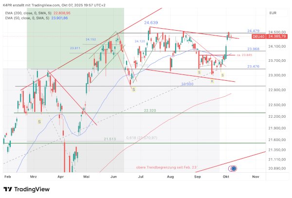 Die Aussage der letzten Tage kann daher fast ohne Einschränkung übernommen werden, erst wenn der DAX mindestens über das Niveau von 24.500 Punkten auf Tagesbasis ausbricht, werden weitere Kursgewinne zunächst an die Rekordstände von 24.639 Punkten wahrscheinlich darüber auf 24.730 Zähler. Auf der Unterseite würde ein Kursrückgang unter 24.269 Punkte einen Kurslückenschluss mit entsprechendem Korrekturpotenzial zurück auf 24.162 Punkte forcieren. Vielleicht aber können einige Eckdaten zur Erzeugung im produzierenden Gewerbe aus August Deutschlands Schwung in den DAX bringen, am Abend wird das Protokoll der letzten geldpolitischen US-Notenbanksitzung vorgestellt.