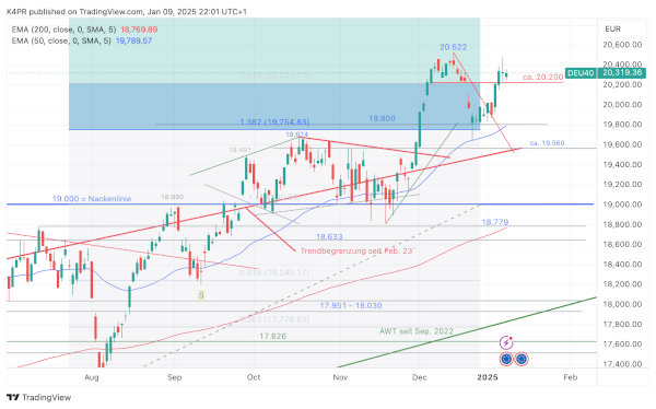 An den Aktienmärkten hat die Dynamik der letzten Tage etwas abgenommen, der DAX pausiert seit Wochenmitte in einer engen Handelsrange von gut 280 Punkten und lässt mit weiteren Signalen auf sich warten. Von daher kann die Aussage der letzten Tage nahezu unverändert übernommen werden. Unterhalb von 20.200 Punkten würden Abschläge auf rund 20.000 Punkte drohen, aber erst darunter würden sich die Anzeichen auf eine längere Konsolidierung mit einem übergeordneten Ziel um 19.000 Punkten sichtlich verdichten. Auf der Oberseite müsste mindestens das Rekordhoch aus Mitte Dezember bei 20.522 Zählern überwunden werden, damit die nächste große Rallyestufe an 20.976 Punkte gezündet werden kann. Aktuell erscheint dieses Szenario aufgrund der schwachen US-Börsen jedoch zweitrangig.