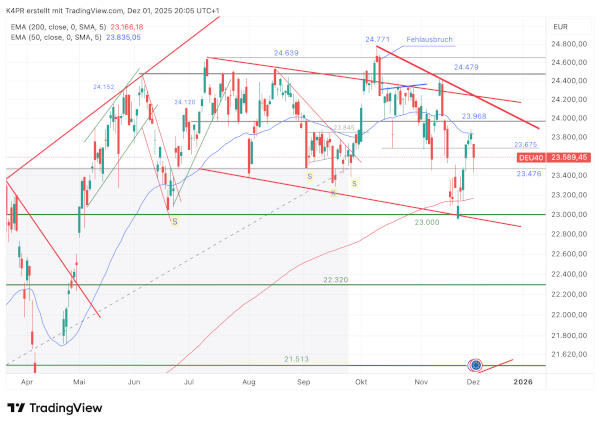 Technisch könnte der DAX in den kommenden Tagen mit etwas Fantasie versuchen, eine inverse SKS-Formation seit Anfang November auszubilden - entscheidend ist der Support bei 23.476 Zählern. Dies lässt für die kommenden Stunden weiteres Aufwärtspotenzial auf 24.200 Punkte und damit die potenzielle Nackenlinie der Formation erahnen. Aber nur ein überzeugender Kurssprung darüber dürfte das Signal in vollem Umfang aktivieren und im Anschluss Kursgewinne an das bisherige Rekordhoch bei 24.771 Punkten und darüber sogar auf 24.961 Punkte ermöglichen. Diese Entwicklung würde sich auch aus technischer Sicht seit dem Novembertief durch die Form einer klassischen 123-Erholungsbewegung decken. Rücksetzer sind derzeit attraktiv, um den DAX auf einem tieferen Niveau auf der Käuferseite zu akkumulieren. Erst ein Tagesschlusskurs unterhalb von 23.382 Punkten würde Zweifel an der Durchsetzungsfähigkeit des Barometers aufkommen lassen, Rücksetzer zurück auf 23.000 Punkte müssten in diesem Fall zwingend eingeplant werden.
