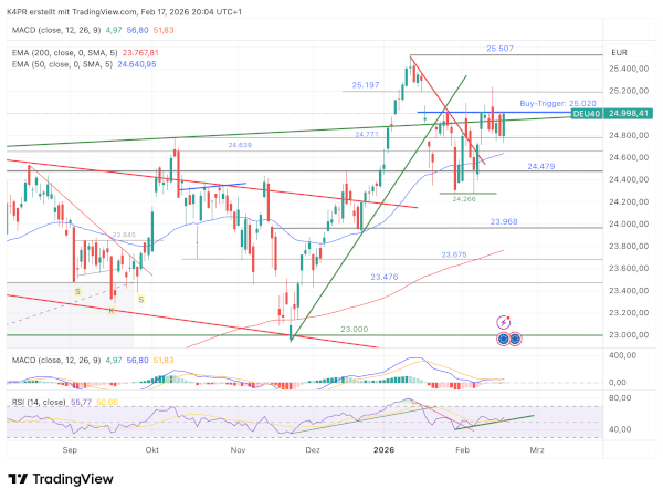 Im Mittelpunkt steht weiterhin die Marke von 25.020 Punkten. Ein Schlusskurs oberhalb dieses Niveaus würde ein neues Kaufsignal auslösen und weiteres Potenzial bis zum bisherigen Rekordstand bei 25.507 Punkten eröffnen. Sollte auch diese Marke überwunden werden, wäre sogar ein Anstieg in Richtung 26.000 Punkte denkbar.