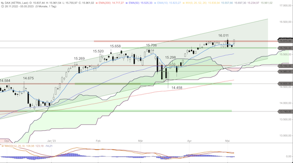 Anlaufmarken nach oben bei 15.980, 16.000, 16.011 und 16.050 Punkten nach unten bei 15.900, 15.850, 15.750 und 15.700 Punkten.